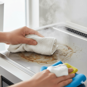 少し熱めのお湯で濡らしたタオルを固く絞り、油汚れの上に数分間置きます。蒸気で汚れが浮き上がってきたら、油汚れ用の洗剤(アルカリ性)をつけた